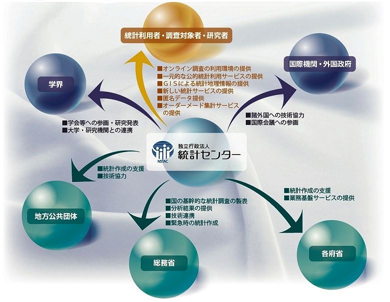 統計作成のほかにも、政府統計の総合窓口(e-Stat)、オンライン調査システム、事業所母集団データベース、統計データの提供システムなどの公的統計の業務基盤・利用基盤を各府省や地方公共団体そして国民・企業の方々へ提供する機能を果たしています。
