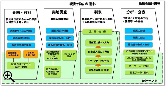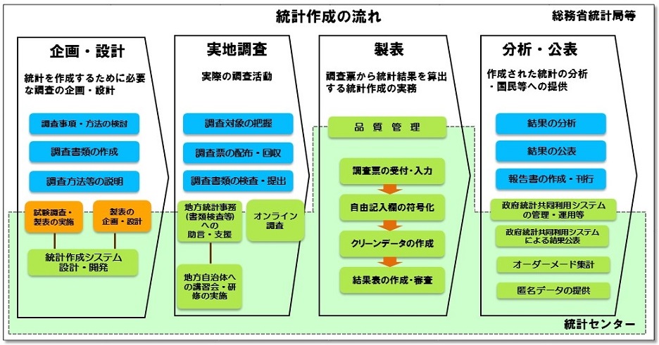 統計は、統計を作成するために必要な調査の「企画・設計」、実際の調査活動を行う「実地調査」、調査票から統計結果を算出する統計作成の実務である「製表」、作成された統計の分析・国民等への提供を行う「分析・公表」の流れで作成されます。統計センターは、総務省統計局等が実施する統計調査について、互いに連携・協力し、一体となって事務を進めています。