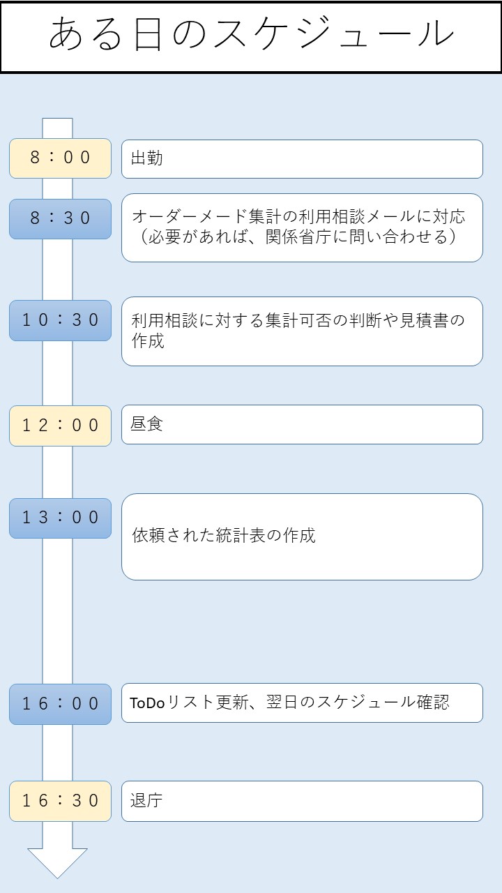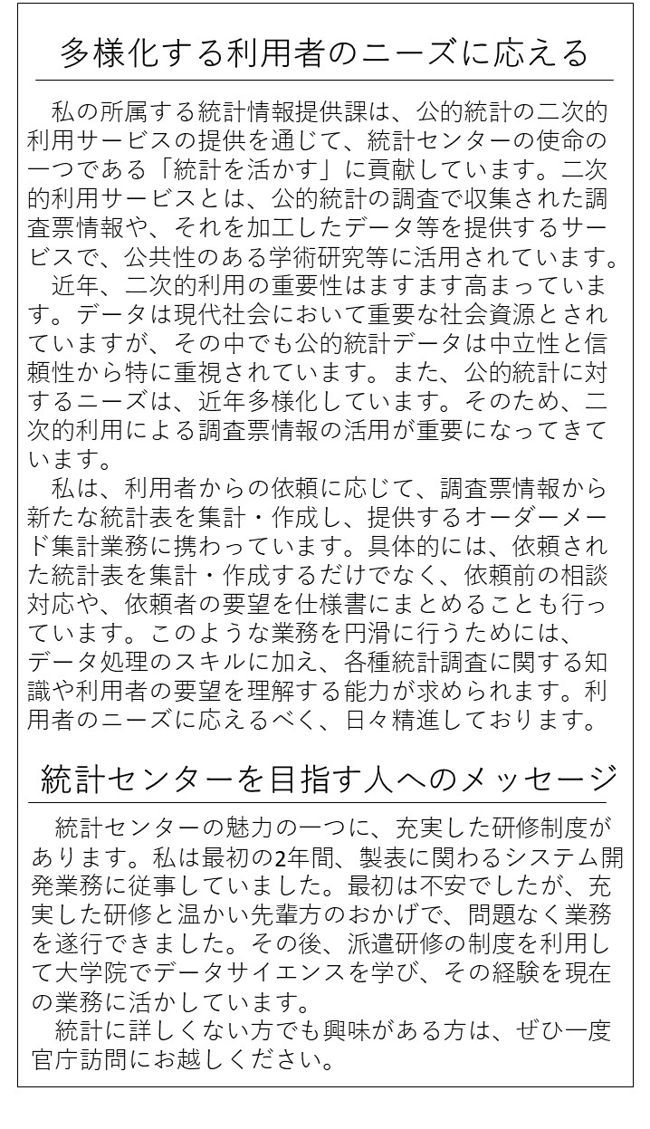 ホーム 採用案内新規職員の採用統計センターの仕事を知る(先輩職員からのメッセージ)先輩職員のメッセージ(統計を活かすについて) 新規職員の採用 先輩職員のメッセージ(統計を活かすについて) 二次的利用により統計を活かす 統計技術・提供部統計情報提供課オーダーメード集計係 加藤 駿典 令和2年採用 令和2年4月 統計センター採用 統計情報システム部情報システム開発課 令和4年4月 滋賀大学大学院データサイエンス研究科 令和6年4月 現職 メッセージ クリックすると拡大します ある日のスケジュール クリックすると拡大します 採用案内新規職員の採用 採用活動へのエントリー 統計センターを志望される皆さんへ(Top Message) 一般職(大卒程度) 一般職(高卒者) 一般職(経験者(係長級)) 統計センターの職場を知る データで見る働きやすさ 新宿オフィス(総務省第二庁舎) 働き方に関する取り組み 各種休暇制度について 統計センターの仕事を知る(先輩職員からのメッセージ) 先輩職員のメッセージ(管理職から) 先輩職員のメッセージ(統計をつくるについて) 先輩職員のメッセージ(統計を活かすについて) 先輩職員のメッセージ(統計を支えるについて) 先輩職員のメッセージ(弛まぬ技術の向上について) 先輩職員のメッセージ(適正な組織運営について) 先輩職員のメッセージ(仕事と育児の両立について) 採用に関するQ&A 統計センターの人材確保・育成方針 業務案内 アンケートフォーム メールアドレス登録申請フォーム メール配信停止フォーム 任期付職員の採用 任期付研究員の採用 非常勤職員の採用 非常勤研究員の採用 選考採用 採用に関する問い合わせ先 政府統計の総合窓口 統計局ホームページ 総務省ホームページ 統計データ利活用センター ミクロデータ利用ポータルサイト