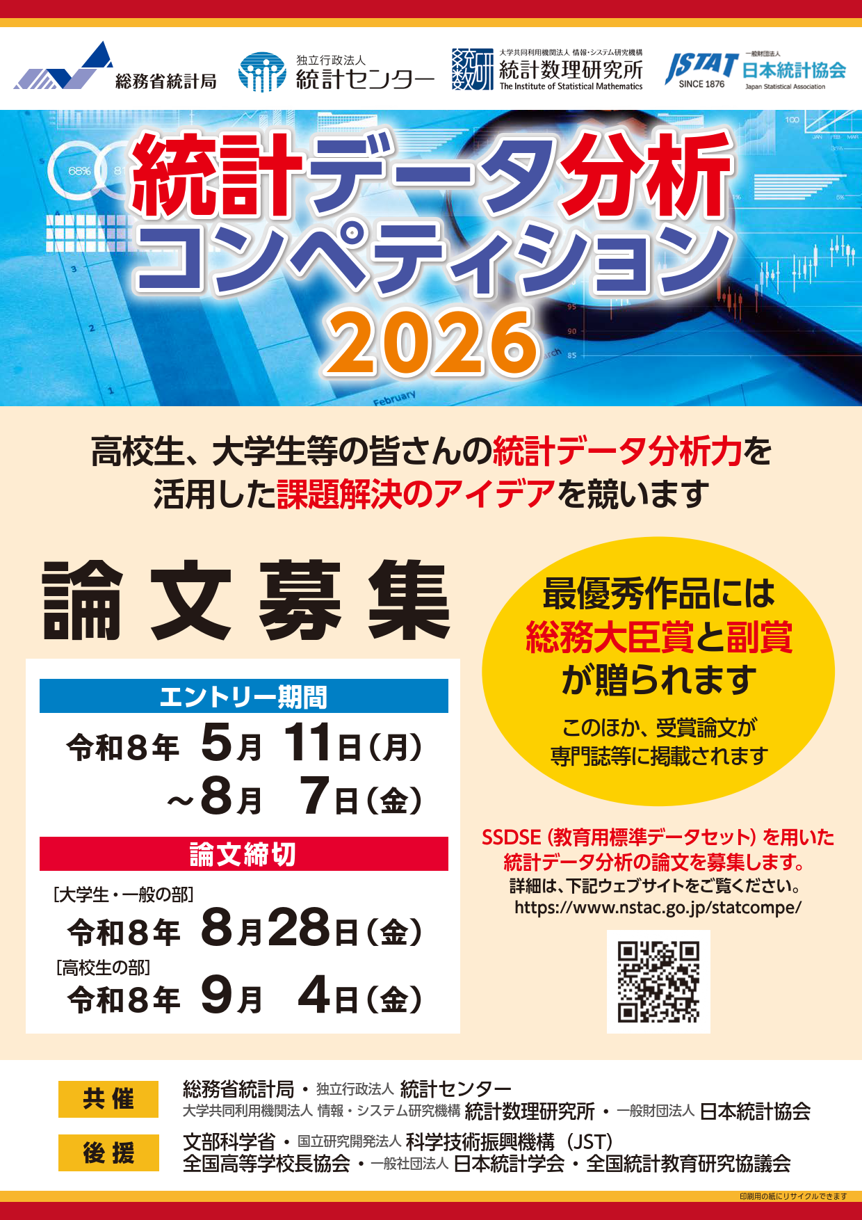 | 表彰 | 優秀な論文には、総務大臣賞、優秀賞、統計数理賞、統計活用奨励賞等が授与されます。 |