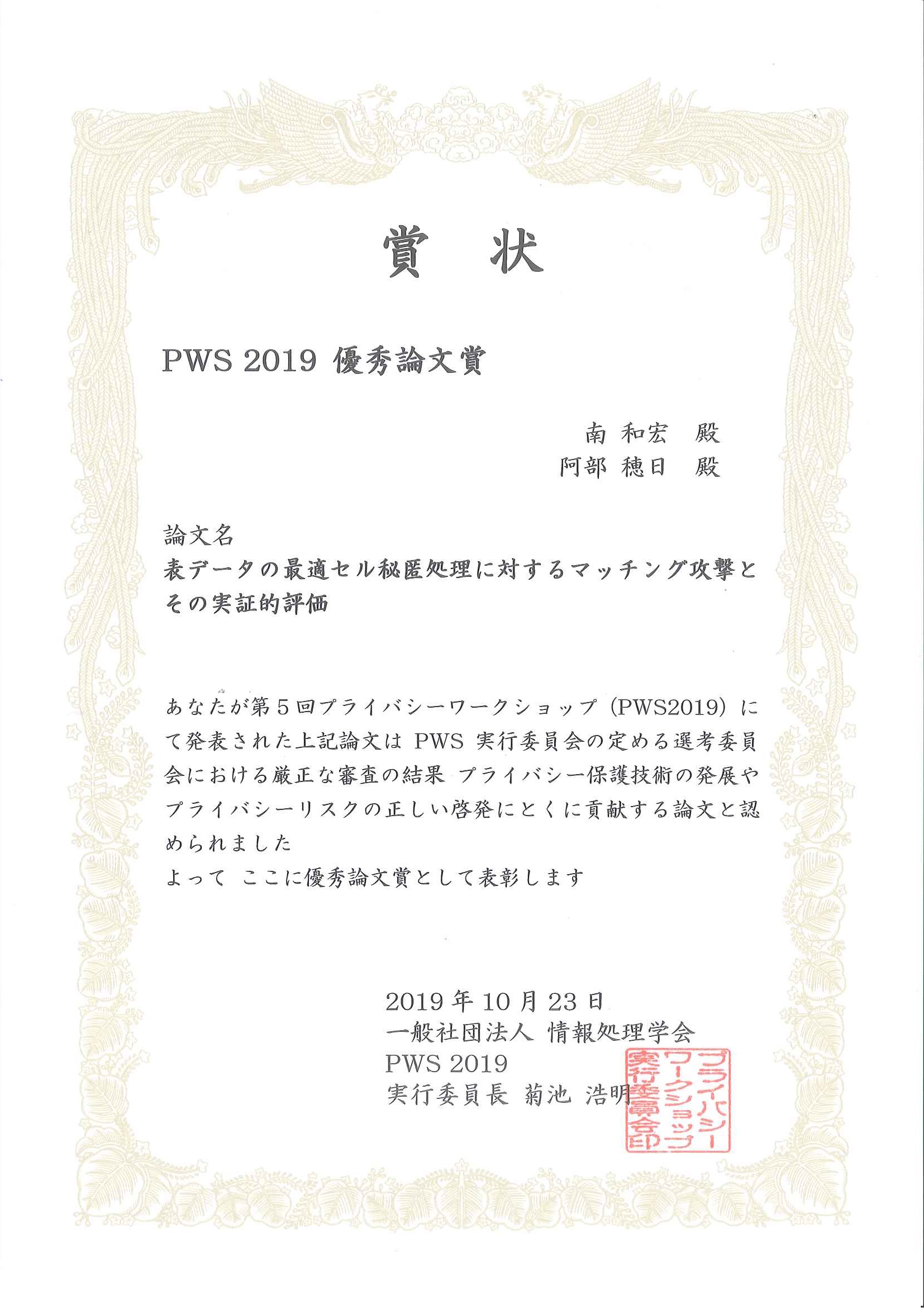 PWS優秀論文賞は、プライバシーワークショップ(PWS)セッションにおける発表論文のうち、「プライバシー保護技術の発展」や「プライバシーリスクの正しい啓発」に特に貢献すると認められる論文を表彰するものです。