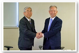 法政大学九段校舎にて、増田総長(法政大学)と戸谷理事長(統計センター)による調印が執り行われ、両長の堅い握手が交わされました。